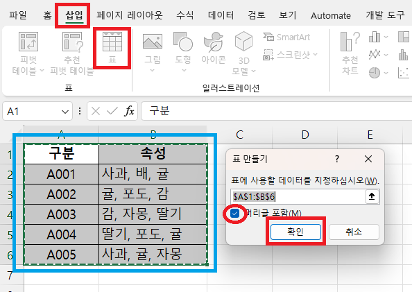 [ 삽입 ] → [ 표 ] → [ 머리글 포함 체크 ] → [ 확인 ]을 눌러