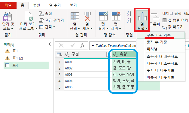 [ 열 분할 ] → [ 구분 기호 기준 ]을 선택합니다.