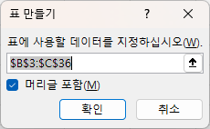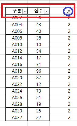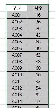 구분하는 제목(위 표의 구분, 점수 같은)이 따로 있다면 머리글 포함을 눌러주시면 됩니다.