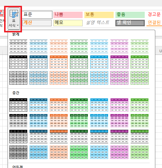 그 다음 홈 → 표 서식을 눌러 마음에 드는 서식을 지정해 줍니다.