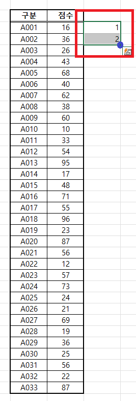 아래 그림과 같이 별도의 열에 숫자 1, 2를 적고 1, 2가 입력된 셀을 선택한 후