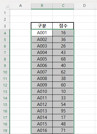 먼저 아래 그림과 같이 조건부 서식을 지정할 셀 범위를 선택합니다.