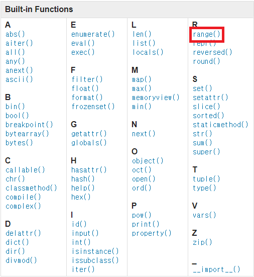 Range() 함수는 파이썬의 내장함수로 특별히 무언가를 import 하지 않아도 사용할 수 있습니다.