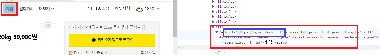[ 게임 ] 부분을 살펴보면 [ a 태그 ]의 요소로